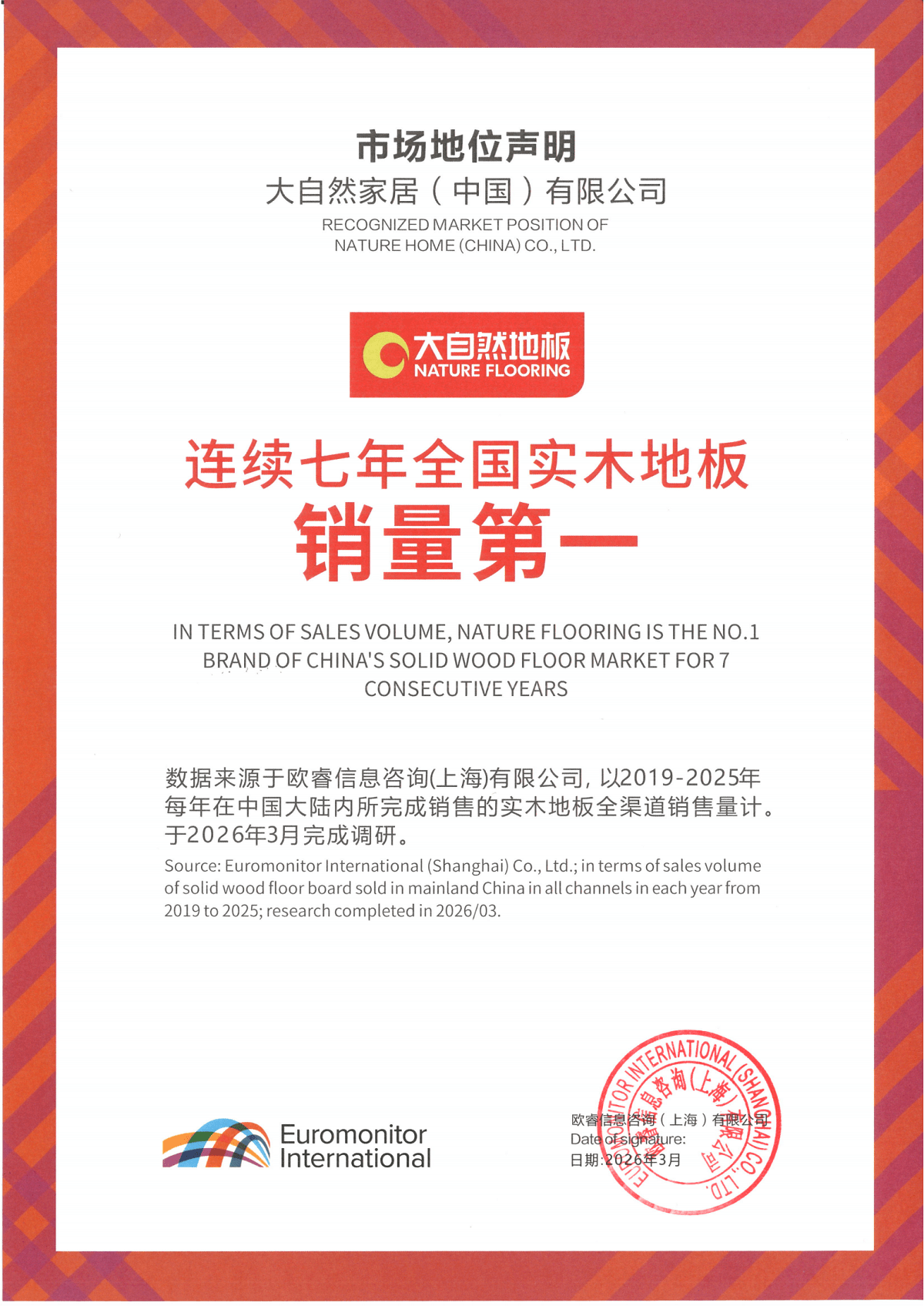 3月10日,大自然家居新零售委員2026首屆盛會(huì)隆重舉辦,會(huì)上,國(guó)際權(quán)威調(diào)研機(jī)構(gòu)歐睿信息咨詢(上海)有限公司發(fā)布最新市場(chǎng)數(shù)據(jù):大自然地板2019-2025連續(xù)七年全國(guó)實(shí)木地板銷量第一。(數(shù)據(jù)來源于歐睿信息咨詢(上海)有限公司,以2019-2025年每年在中國(guó)大陸內(nèi)所完成銷售的實(shí)木地板全渠道銷售量計(jì)。于2026年2月完成調(diào)研)。